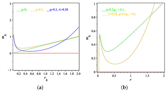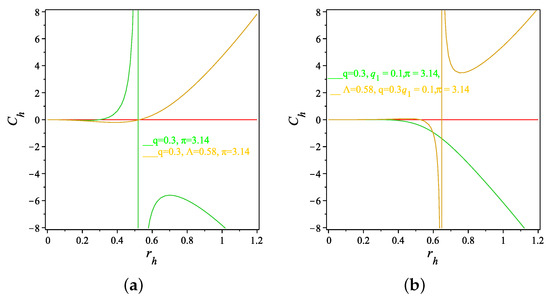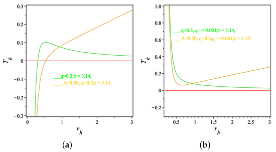 One of the most exciting topics in physics is the black hole thermodynamics. Two approaches have been constructed to extract the thermodynamical quantities of the black holes. The first approach, which was given by Gibbons and Hawking [98,99], was to study the thermal properties of the Schwarzschild black hole solution through the use of the Euclidean continuation. In the second approach one has to identify the horizon then define the temperature and finally study the thermodynamical stability of the black hole [100,101,102,103,104,105,106,107,108,109,110,111,112,113,114,115,116,117,118,119,120,121,122,123,124]. In this study, we will follow the second approach to study the thermodynamics of the black holes derived in Equations (22), (28), (42) and (48) then analyze their thermodynamical stability. It is of interest to mention here that these black holes are characterized by the mass, m, the charges (monopole, q and quadrupole, ) and also by the cosmological constant .