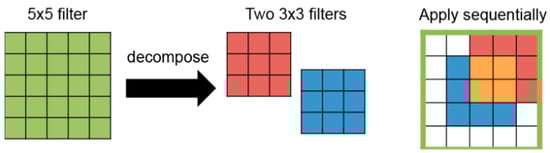 VGG-16 consists of 13 convolutional layers and three fully connected layers. In this model, larger filters (e.g., 5 × 5) are built from multiple smaller filters (e.g., 3 × 3) (Figure 2). Therefore, all convolutional layers have the same filter size of 3 × 3. In total, VGG-16 requires 138 M weights and 15.5 G multiply-and-accumulates to process one 224 × 224 input image []. The VGG model has been used in many studies [,,] so far.