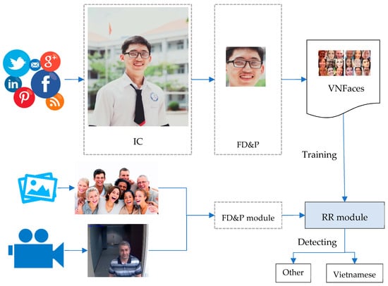 After RR is trained on the VNFaces dataset, any image from different environments, e.g., other social networks or surveillance videos, can be put into the FD&P module to extract and preprocess the face. Next, the RR module can identify whether or not the person that appears in this image is Vietnamese.