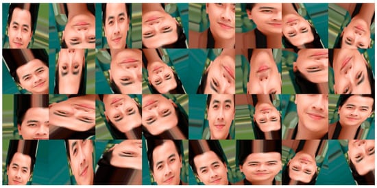 The input images for this model are rescaled to 64 × 64 to help reduce the complexity of training and testing. To generate more input images as well as to increase the accuracy of this model, we applied random flip, zoom, and shear rotate features for each face. Figure 5 shows the augmented images which were augmented by random flip (both horizontal and vertical), zoom (zoom range is 0.3), and shear rotate (sheer range is 30 degrees) with batch_size = 32.