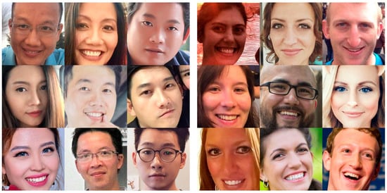 To conduct the experiment, the IC module was used to collect user information on Facebook including profile picture and race from users of different ages and races. These profile pictures have varying pose, accessories, illumination, and imaging conditions. The second module, named FD&P, was used to automatically detect (using the Haar Casecade classifier []), crop, and label 6100 faces, including 2892 Vietnamese and 3208 Other, forming a collection called the VNFaces dataset (Available at https://goo.gl/M8eww3). Figure 6 shows a sample of Vietnamese (left) and Other (right) faces.