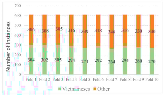 To avoid the overfitting problem and to make the classifier generalizable to independent datasets, we employed 10-fold stratified cross-validation for the VNFaces dataset. We used nine folds for training and the last fold for testing. In the training procedure, the weight parameters of the CNN model were optimized automatically using the training set only. The testing set was hidden from the CNN model and only used after training was complete. Figure 7 shows the numbers of Vietnamese and Other face images in each fold utilized in this experiment.