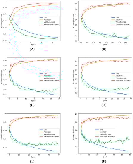 Performance of RR-CNN with 10 (A), 20 (B), 30 (C), 40 (D), 50 (E), and 60 (F) epochs.