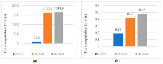 Next, we compared the computation time for each fold including training and testing time among RR-CNN, RR-VGG1, and RR-VGG2. The results (Figure 9) show that RR-CNN requires 91.3 s while RR-VGG1 and RR-VGG2 take a much longer at 1623.1 s and 1648.9 s, respectively. This is obvious because RR-VGG (including RR-VGG1 and RR-VGG2) has more layers than RR-CNN. Hence, RR-VGG’s structure is much more complex than that of RR-CNN. In short, RR-CNN is more efficient than RR-VGG (including RR-VGG1 and RR-VGG2) in terms of the computation time.