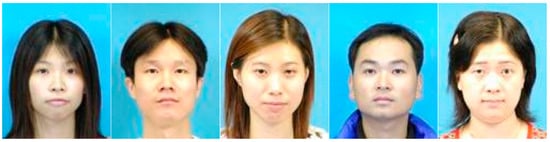 In the first experiment, we used the proposed models to perform classification of Japanese, Chinese, and Brazilian datasets; the Japanese Female Facial Expression (JAFFE) [], Chinese University of Hong Kong Face Sketch (CUFS) [], and Brazilian face database captured at the Artificial Intelligence Laboratory of FEI (FEI) datasets [], respectively, were used as the image sources. The JAFFE dataset includes 213 images of seven facial expressions of 10 Japanese female models, as exemplified in Figure 10. The CUFS dataset has 188 images of 188 Hong Kong students, and FEI contains 14 images for each of the 200 individuals, 2800 images in total, with examples from the datasets shown in Figure 11 and Figure 12, respectively. We conducted experiments classifying each race out of the combined dataset produced by adding images of 3208 other people (including Asian, African, and Caucasian) to each dataset as described in Section 4.1. We used 80% of people in each race for training and the remaining 20% for testing, as described in Table 3. These experiment settings make sure that the splitting process is a subject-independent partition where people in the training and testing sets are completely different. The results are reported in Table 4. It is shown that the proposed models both work well in all other race datasets tested. This has proven that our defined CNN model and fine-tuning VGG models could be used in RR problems, with fine-tuning VGG achieving the best accuracy.