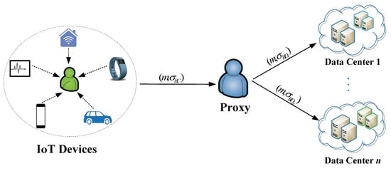 - Proxy: This entity is usually served by a semi-trusted server with a certain computation and communication power. To ensure the security of data storage, IoT data are stored by multiple data centers for consumers of different security levels. The proxy uses the re-signing key to convert the signature generated by the IoT device into a group’s signature for the same message m, so that the data center only knows that is a valid signature on m, but cannot infer the identity of the real signer. After receiving , another proxy uses the re-designate-verifier key to convert the signature into the signature for every data center, and it sends the IoT data m and to the i-th data center, where .