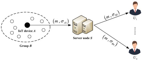 - S calculates the signature using the re-signature key . That is, the server node S converts the signature of the IoT device into the signature on m of the group B.