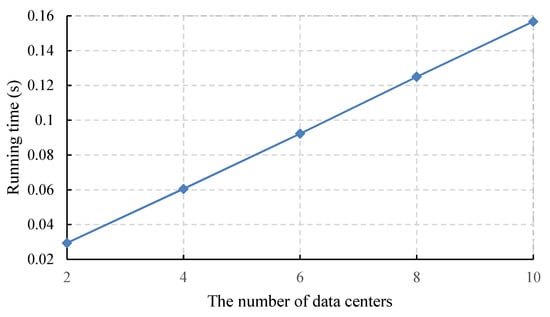 In the data transmission phase, the server node needs two exponentiations to convert the signature of the IoT device into the signature of its group. In addition, the server node needs two exponentiations to change the data center in to the data center . Figure 4 shows that when the total number of data centers is 2, 4, 6, 8 and 10, the computational overhead required by the server node is approximately 29 ms, 60 ms, 92 ms, 125 ms and 156 ms, respectively.