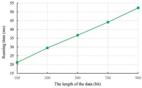 where can be pre-computed. When the length of the data is 100 bits, 300 bits, 500 bits, 700 bits and 900 bits, the time overhead required for each data center is as shown in Figure 5. Because the server nodes and data centers have strong computing power, our proposal has practical application.