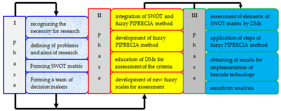 Figure 1 shows a complete course of research that implies assessing the conditions for implementing barcode technology in a warehouse system with the development of a new fuzzy PIPRECIA method. The initial phase involves recognizing the necessity for research in the first step, after which the defining of problems and aims of research has been performed in the second step. In order to enable adequately access to the assessment of the conditions for evaluating the implementation of this information technology in the warehouse system of Natron-Hayat, SWOT analysis was carried out. The SWOT matrix of 27 elements was formed, representing the third step of this phase. The final step of the first phase of research is the formation of a decision-making team that implies the managers of the company’s warehouse system in which barcode technology needs to be implemented. In order to assess criteria adequately by decision-makers, new fuzzy scales, which are methodologically specific and related to the development of the fuzzy PIPRECIA method, have been formed. In the first step of the second phase, two new fuzzy scales have been developed, which are explained in more detail below in a fuzzy PIPRECIA method algorithm. The second step is specific for the formation of such models as it relates to the education of decision-makers for assessment of criteria. Since it is about extending the PIPRECIA method [51] with fuzzy numbers and since new evaluation scales are defined and have not been used before, it is necessary to explain to the decision-makers the way how they are applied. Since a part of the research team is located in a town near the company, they have briefly lectured on new scales to provide an adequate assessment at the very start and eventually objective results that will help the company. The third step of the second phase is the development of a new approach with its steps explained in detail below. The fourth step of the second phase is the integration of SWOT matrix and fuzzy PIPRECIA method. The third phase begins with the assessment of criteria in the first step, so that the second step includes an analytical part that implies data processing and the calculation of results. Finally, a sensitivity analysis was performed by calculating correlation coefficients.