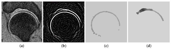 Initial segmentation of femoral cartilage and acetabular cartilage from an MR image of hip joint. (a) MRI of a hip joint. (b) Articular cartilage after enhancement. (c) Femoral cartilage after image binarization. (d) Acetabular cartilage after image binarization.