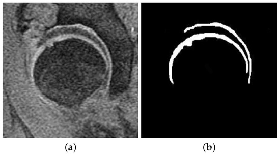 Segmentation results of articular cartilage on one hip joint with moderate OA. (a) Original image, (b) Segmented cartilage.