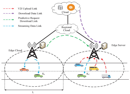 We consider a vehicular network for a unidirectional road, which consists of multi-edge computing nodes deployed at the edge cloud layer. Each edge computing node includes a BS connect to the MEC server. The list of BSs are denoted as . The regional cloud at the middle-tier coordinates the information exchange between edge computing nodes. Additionally, for better support vehicle mobility, the control and data planes are separated, whereby the regional cloud monitors the message transmission in centralized management. Meanwhile, the edge layer primarily provides data services. On the top is a centralized data center (core cloud), where the VSP deployed its service, as shown in Figure 1. Generally, a core cloud has the biggest scale, a regional cloud is smaller than a core cloud, and an edge cloud has the lowest scale [33]. While a core cloud has undisputed advantages of computing capabilities compared to the edge cloud, the networking latency accessing edge services is remarkably decreased due to the shorter distance. By this, the VSP tends to negotiate with IPs (infrastructure providers) to deploy their service at the BS in the edge cloud layer, bringing their service in close proximity to mobile vehicles. The distance between any two adjacent BSs is denoted as L. The transmission range of each BS is the coverage radius, denoted as . The road can be divided into several segments with length L. A moving vehicle in a given segment can only access the BS deployed in the corresponding segment through V2I communication. It acts not only as a service’s user but also a volunteer node, which provides data resources for the VSA.