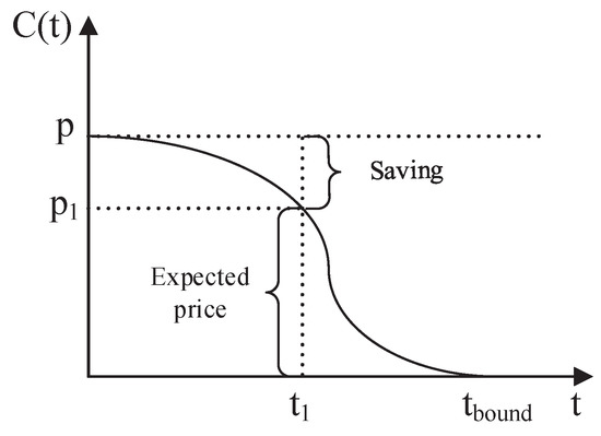 where p is the original charge for obtaining data in the core cloud and b is a positive constant integer, while is defined as the total delay to upload the file f from the vehicle to the BS, and denotes the data rate. The curve represents the price the BS pays for VUs when the delay time keeps increasing. For example, as shown in Figure 2, with delay , the VSP pays dollars for a VU. Without receiving the same content from nearby vehicles, the VSP must pay p dollars for downloading data in the remote server. This shows that the VSP is saving dollars if they acquire data from VUs. However, the VSP will not obtain data from VUs if the delay exceed the bound . This result is reasonable because the cost of using data in the origin server (core cloud) is the sum of the costs of storage and processing, which is strictly higher than the cost of the smallest amount of capacity that might be accessed through a volunteer node [44].
