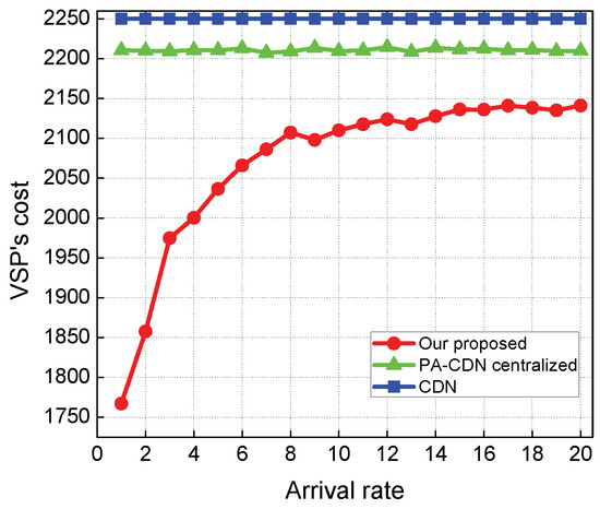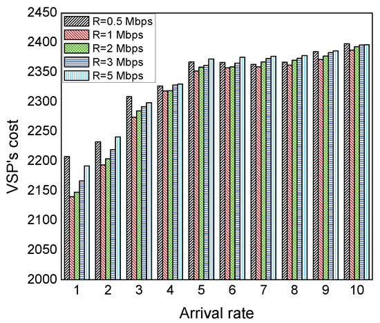 Figure 8 shows the VSP’s cost under different average data rates. In this experiment, we change the value of among Mbps to investigate the performance of our proposed mechanism. The horizontal axis is represented by the different arrival rate of requests. As shown, when Mbps, the VSP’s cost spending is frequently higher than the others. This is because if the average transmission rate of each VU is lower, then the time needed to completely upload data into the BS is longer. Hence, to guarantee QoS for the VSA, the BS tends to download data from the remote content server. Otherwise, the remaining results induce that the paying cost is inversely proportional to the data rate, based on Equation (5).