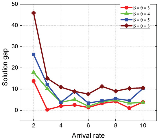 Figure 6 presents the VSP’s cost gap when the traffic/network is changed over time. We compare the difference of the solution of problem (20) when seconds with the solution of problem (16) when . According to the results, the solution gap increases when the variance of traffic/network is larger (from 3 s to 8 s). For a specific value of (or ), the solution gap decreases when the arrival rate increases. When increases, VSP tends to download data from the remote server rather than from volunteer nodes so as to satisfy the QoS requirement. Hence, the difference between solutions in (20) when to 8 and solutions in (16) is reduced.