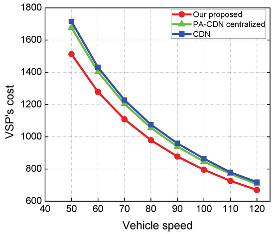 Figure 7 presents the VSP’s cost under different vehicle speeds. For this experiment, we also generate a sequence of ten requests arriving at the BS, but they are generated with the same arrival rate for each speed. As shown, when the vehicle has a faster velocity, the total data it can receive from the BS’s streaming process is lower during traveling time. Hence, we can see that all three mechanisms have lower spending costs with faster vehicle speed. Moreover, the difference between our proposed mechanism and the two baseline mechanisms is higher when the vehicle speed is lower and vice versa. The reason for this result is that when the speed is low, the BS’s cost-saving is efficient because it obtains data from VUs. However, when the speed is high, the time delay constraint of each task is more strictly bound. Therefore, the BS tends to download data from the higher layer cloud rather than from VUs.