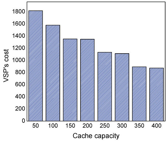 We now conduct an experiment for the scenario when the BS has already cached a part of the requests. The purpose is to investigate the relationship between cache size and the VSP’s cost spending. Figure 9 shows the VSP’s cost under different BS cache capacities. The cache capacity is defined as the number of files that can be stored at the BS. With this experiment, we set the size of the BS cache as files out of a total of files. For the VSA, the Zipf exponent is set as 0.56 based on real data statistics from YouTube [54]. The cache miss ratio is identified by averaging of 100 generated requested files to the BS corresponding to each cache size. It can be seen that the optimal VSP cost-saving increases with cache capacity since a larger cache capacity can increase the cache hit ratio when fetching content. In particular, the VSP’s cost-saving can achieve approximately 52% when increasing the cache size from 50 to 400.