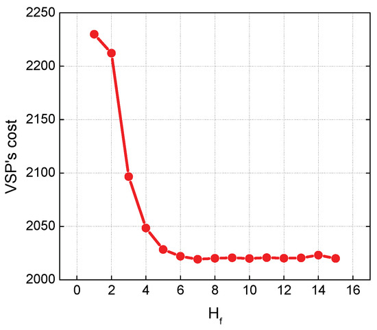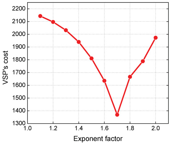 Figure 11 presents the effect of hyper-parameter on the VSP’s cost. From Equation (5), while p is a fixed cost between two values b and , we realize that the exponent factor will have a much greater impact on the total cost. Hence, we set up the experiment with a range of values of from 1.1 to 2 to analyze its effect. It can be seen that the VSP’s cost decreases gradually from 1.1 to 1.6, reaching the lowest point of . The reason is clearly shown in Equation (5), where the cost decreases with the value. However, when is greater than 1.7, the VSP’s cost goes up noticeably. This is caused by the upper bound of the upload time in Equation (5), . The required upload time t is shorter when increases. In addition, the average data rate does not change. Hence, the time constraint (21a) is violated. To guarantee the performance, the BS has to fetch content from the remote server, which then causes the increased cost.