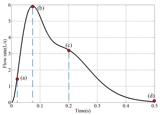 Cough flow rate variations with time (a: 0.02 s, b: 0.08 s, c: 0.2 s, d: 0.5 s).