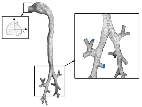 - van Erbruggen, E.; Hirsch, C.; Paiva, M. Anatomically based three-dimensional model of airways to simulate flow and particle transport using computational fluid dynamics. J. Appl. Physiol. 2005, 98, 970–980. [Google Scholar] [CrossRef] [PubMed]