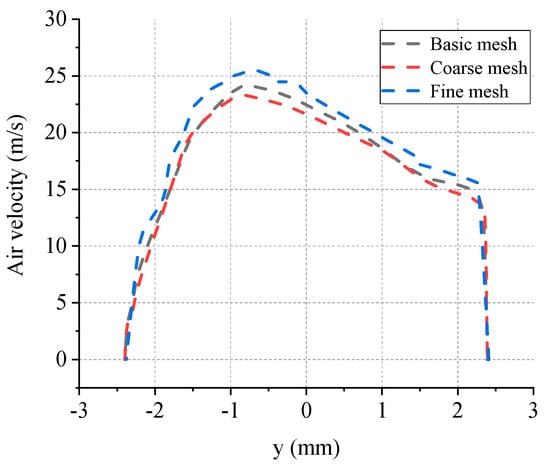 Three models with an increasing number of mesh which are coarse mesh (190941), basic mesh (444204) and fine mesh (2563271 cells) were generated and analyzed. The air velocities along the y direction on the outlet surface were compared and presented in Figure 3. The results showed a limited difference among three models and suggested that the basic mesh could be used in further analysis.