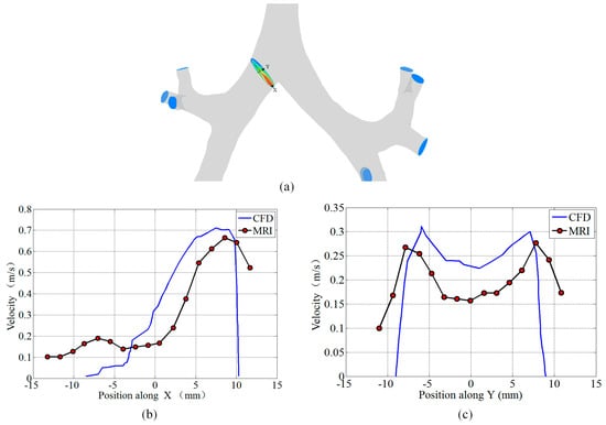 In order to validate the model and computational methodology, our simulation results were compared with the results measured by Rochefort using magnetic resonance (MR) gas velocimetry under the same boundary conditions []. The comparisons of the cross-sectional area and volume flow rate are shown in Table 1. The location of the extracted face, X direction and Y direction are presented in Figure 4a. The velocity comparison between our CFD simulation and Rochefort’s results at the right main bronchus is presented in Figure 4b,c. In addition, the CFD simulation results were consistent with the MRI results which validates the model and computational methodology used in this study.