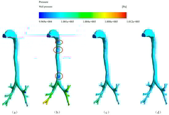 The spatial distribution of wall pressure is shown in Figure 6. The wall pressure decreased gradually from the end of the bronchi to the mouth exit at atmospheric pressure. The highest wall pressure reached was 1.012 × 105 Pa (absolute pressure) which appeared at the end of the bronchi. Due to the high airflow velocity, the wall pressure at some places, which have been labeled by a red circle, was below the atmospheric pressure.