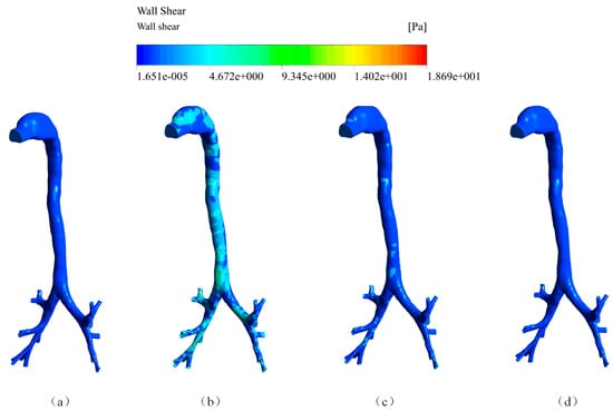 The wall shear stress at four time points (a) 0.02 s; (b) 0.08 s; (c) 0.2 s; (d) 0.5 s.
