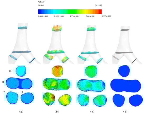 Four cross sections, captured from the trachea, joint, left main bronchus and right main bronchus, were selected to analyze the local flow properties. They were named f0, f1, f2 and f3, respectively. The velocity magnitudes and vectors at these four sections during a cough process are presented in Figure 8. From Figure 8 we can observe that the velocity magnitude at f0 was higher than that at f2 and f3 because of the airflow confluence. Since the area of f1 is larger than f0, the velocity magnitude at f0 was also higher than that at f1. A second flow was observed at four cross sections, as shown in Figure 8b,c, when the airflow was higher than others. The secondary flow direction was from the inner to the outer of the wall.