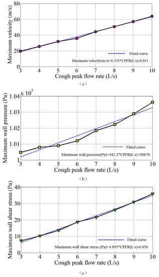Eight different cough peak flow rates from 3 to 10 L/s were involved in the simulation study. The relationship between airflow dynamics and the cough peak flow rate is given in Figure 9. We found a positive correlation between the maximum velocity, wall pressure, wall shear stress and cough peak flow rate. As the cough peak flow rate increased, the maximum velocity, wall pressure and wall shear stress increased linearly. The first-order linear fitted curves for the maximum velocity, wall pressure and wall shear stress are presented in Figure 9. When the cough peak flow rate reached 10 L/s, the maximum velocity, wall pressure and wall shear stress reached 63.93 m/s, 1.0326 × 105 Pa, and 35.91 Pa, respectively.