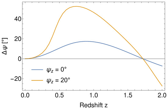 Difference of the observed polarization angle between photons of observer wavelengths of 1033 nm and 443 nm that were emitted with the same linear polarization angle (blue) and (orange) as a function of source red shift. The photons arrive from the direction of GRB 990510, and with all other SME coefficients set to 0, resulting in an angle of the eigenmode in the plane of the Stokes space of .