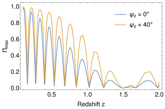 Effective polarization of light observed through the HOWPol R-band filter arriving from the direction of GRB 091208B if the light at the source is 100% linearly polarized with a wavelength-independent polarization angle as a function of source redshift. For this illustration, the SME coefficients were set to 0, except for . The depolarization is due to averaging over the bandwidth of the filter and the rotation of the polarization angle, as shown for example in Figure 1, as well as the change of linear into circular polarization described by the Müller matrix (Equation (10)). The combination of these two effects leads to the observed “ringing”. As described in Section 2, the effect depends on the linear polarization angle at the source.