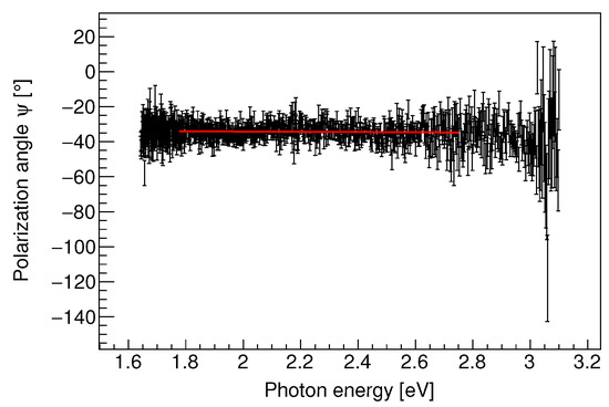 Example of a spectropolarimetric measurement. The figure shows the polarization angle of 4C 14.23 as a function of photon energy observed on 23 November 2009. The red line is a linear fit in order to determine for comparison with Equation (28) to calculate the probability in Equation (29). All fit results are listed in Table A3.