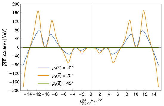 Rotation of the linear polarization angle with energy according to Equation (28) as a function of the SME coefficient while keeping all other SME coefficients at 0. The source was assumed to be at redshift with a codeclination of °. Results are shown for three different values of the polarization angle at the source, . For °, the Stokes vector rotates out of the plane, but the linear polarization angle does not change because (see Equations (26) and (27)).