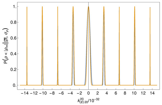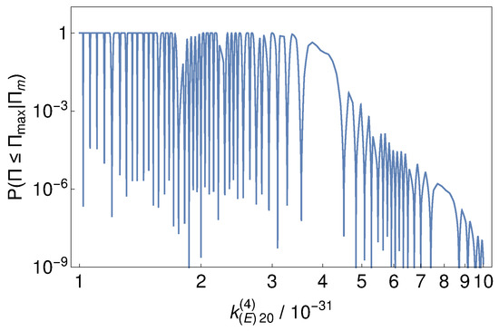This result quantifies the probability that a given set of SME coefficients is compatible with the measurement. Typical examples of the integral as a function of the upper limit are shown in Figure 11. In practice, we replace from Equation (38) with a simple Gaussian distribution with mean and standard deviation if due to numerical issues when evaluating the Bessel functions for large values of N. The error in this case is . An example of this cumulative distribution as a function of one of the SME coefficients is shown in Figure 12.
