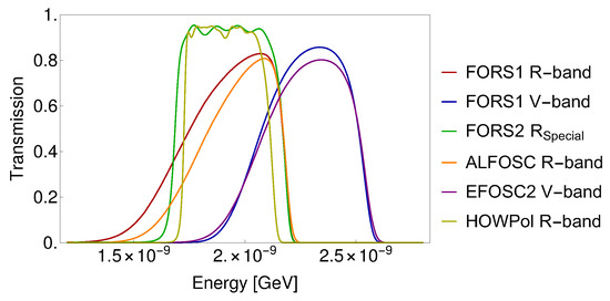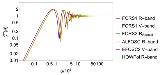 The function determines the reduction of the observable linear polarization. It shows only a minor dependence on the exact shape of the transmission curve (compare for example the FORS1 R-band and the FORS2 filters), but a clear dependence on the energy range covered by the filter can be seen: for small values of , the V-band filters lead to larger values of than the R-band filters, and hence stronger sensitivity to Lorentz invariance violation. It is easy to show that in the limit of large SME coefficients