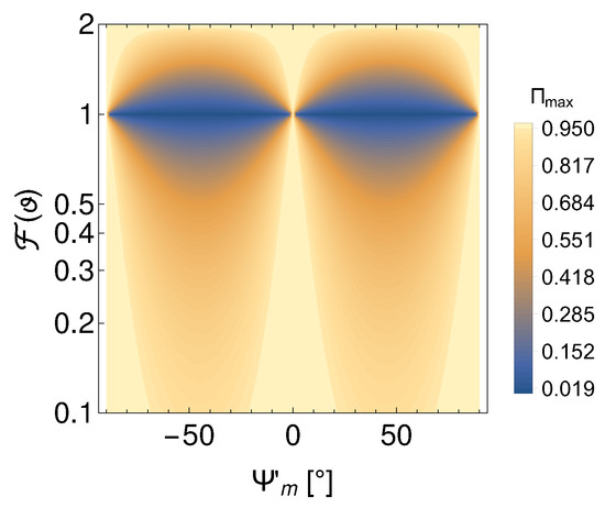 Given a set of SME coefficients, source distance and direction , we use Equations (34) and (35) to find the largest possible polarization fraction given a measured polarization angle . It is important to note that this does not imply the assumption of 100% polarization at the source, but simply reflects the fact that we do not want to make any assumptions about the astrophysics of the source. In realistic models, the polarization of optical emission from blazars is expected to be at most on the order of 20–30% [32,33]. Using such models as input, significantly tighter constraints would be possible. However, optical polarization of blazars is highly variable (see, e.g., [34]), and in case of GRB afterglows significantly higher degrees of polarization are possible [35]. To be conservative and to avoid systematic uncertainties, we decided against using detailed source models, and follow the approach used in previous work [19,20].