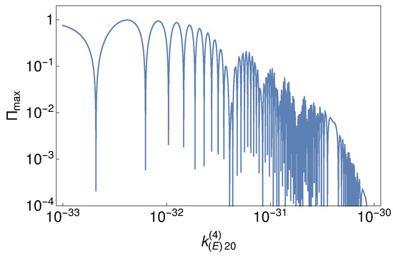 An example of this probability as a function of one of the SME coefficients is shown in Figure 5. The spikes are due to the roots of , but their width decreases with increasing SME coefficients. A single observation cannot be used to place constraints on the SME coefficients, unless additional assumptions are made. However, combining multiple observations will lead to tight constraints roughly corresponding to the width of the central peak, because the spikes at larger values of the SME coefficients will not line up for different sources.