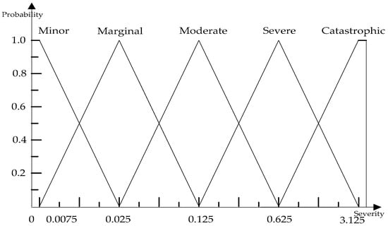 Input language fuzziness refers to the process of transforming the known risk information into a risk level with a certain degree of membership, according to the MF and fuzzification. For example, the likelihood of occurrence of “psychological abnormality” is 0.015, the severity of consequence is 0.02, and the result of fuzziness can be expressed as {(remote, 0), (rare, 0.875), (infrequent, 0.125), (occasional, 0), (frequent, 0), (regular, 0)}; {(minor, 0.25), (marginal, 0.75), (moderate, 0), (severe, 0), (catastrophic, 0)}.