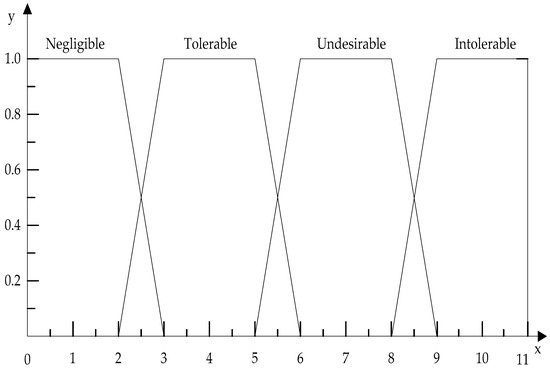 According to the “as low as reasonably practicable” (ALARP) principle, as practiced in the UK, special-line shunting risks are classified into four categories: intolerable, undesirable, tolerable, and negligible [6]. Combined with fuzzy theory, different risk levels are assigned different risk values to establish the MF of risk levels as shown in Table 3 and Figure 4.