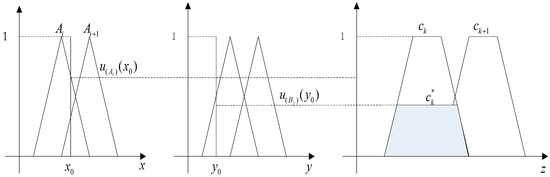 Assuming that the input language (x0, y0) is fuzzified, the membership degree to which x0 belongs to the fuzzy subset Ai is , and the membership degree to which y0 belongs to the fuzzy subset Bi is , the fuzzy rules that are activated are: “if x is Ai and y is Bi, then z is Ck,” and the excitation intensity aq obtained by fuzzy rules Rq can be obtained by Equation (1):