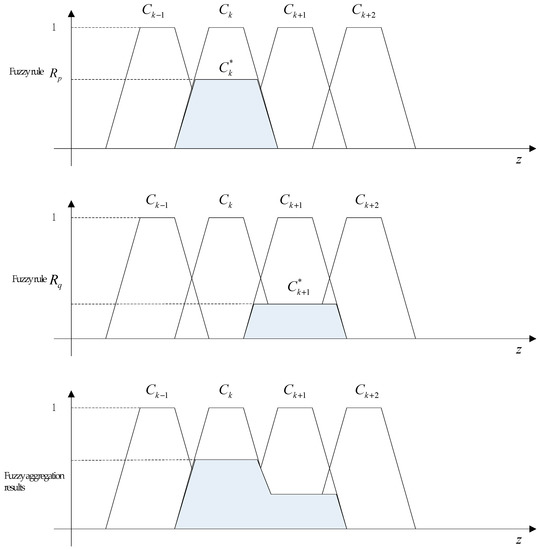 From Figure 5, we can see that for x0 belonging to two different fuzzy sets Ai and Ai+1, besides activating the fuzzy rules Rq, it can also activate other fuzzy rules. Fuzzy aggregation is the process of integrating the mapping results obtained under all activated fuzzy rules. The integrated result represents the output fuzzy set of the whole fuzzy reasoning conclusion, corresponding to the union set of fuzzy relations of each fuzzy rule, as represented by Equation (3) [19]. The process is shown in Figure 6.