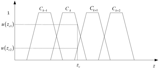 where zc represents the output value of the FRA conclusion. Substituting this value into the initial MF, we can complete the qualitative transformation of fuzzy reasoning results. As can be seen from Figure 7, the membership degree to which the output value belongs to Ck is u(zc1); that to which it belongs to Ck+1 is u(zc2) [20].