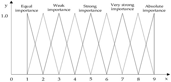 In the process of pairwise comparison, FAHP uses triangular fuzzy numbers as the evaluation scale for estimation in the following form: aij = (lij, mij, uij) where aij is the score given by experts on the importance of the item element i relative to the item element j, and lij, mij, and uij are evaluation scales from 1 to 9 satisfying the relationship lij ≤ mij ≤ uij. lij and uij respectively represent the minimum and maximum values of the fuzzy range and mij is the value considered by experts as the most representative of the relative importance of the two elements [20,21,24]. The meanings expressed by different score ranges are shown in Table 5 and Figure 8.