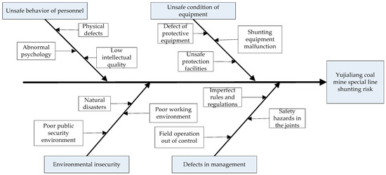 The fishbone diagram for the Yujialiang Coal Mine special line, constructed according to the classification and analysis of the hazard factors, is shown in Figure 9.