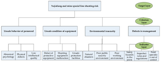 According to the fishbone diagram of the hazard factors, the hierarchical structure of “target layer–criterion layer–indicator layer” is constructed as shown in Figure 10: