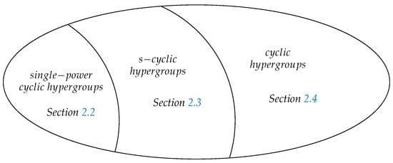 Finally, let us point out that the class of cyclic hypergroups, i.e., the one using canonical projection, is the broadest one. Some cyclic hypergroups are s-cyclic and some s-cyclic hypergroups are single power cyclic; see Figure 1.
