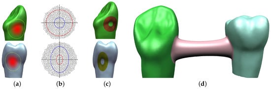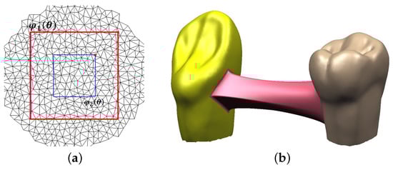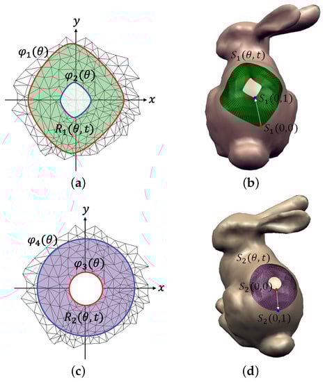 where . Figure 5a shows an example of parameter region bounded by and , and Figure 5b shows the corresponding base surface constructed by . Note that corresponds to the outer boundary and to the inner one, respectively. Similarly, the other base surface, , can be constructed by , where is a local parameterization of in and is a parameter region defined by two closed curves and (see Figure 5c,d).