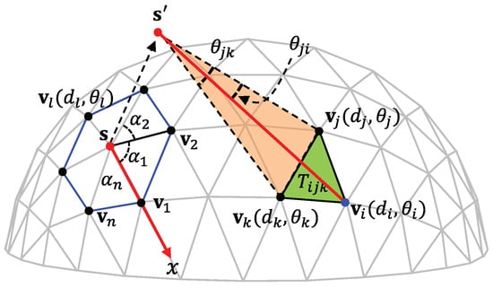 We select an arbitrary edge incident to for x-axis (see Figure 2). The first step is to find the geodesic polar coordinates , of one-ring neighbor vertices of . Geodesic distances can directly be determined by the edge distances, and the corresponding polar angles can be computed as follows: